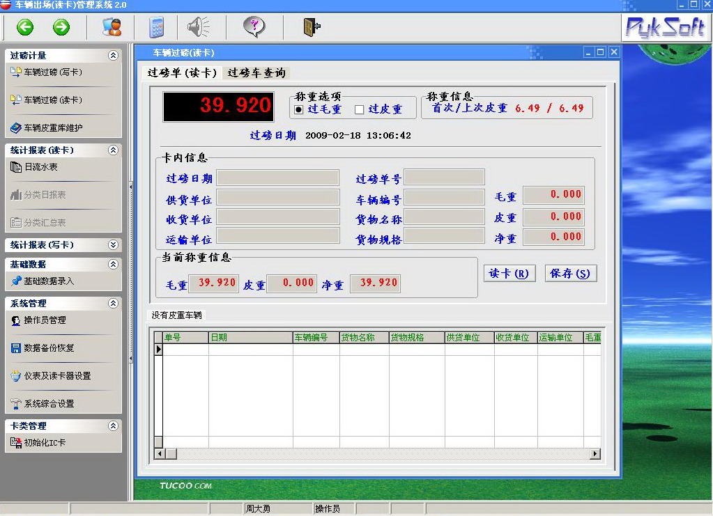 本系统广泛应用于煤矿、煤站、煤炭运输公司等单位。本系统可重车过磅,并将数据存储在IC卡(使用非接触式IC卡读写器)中,车到目的地后,通过本系统,可将卡中数据读出。这样有效防止有些人员在运输过程中偷煤减煤等非法操作。